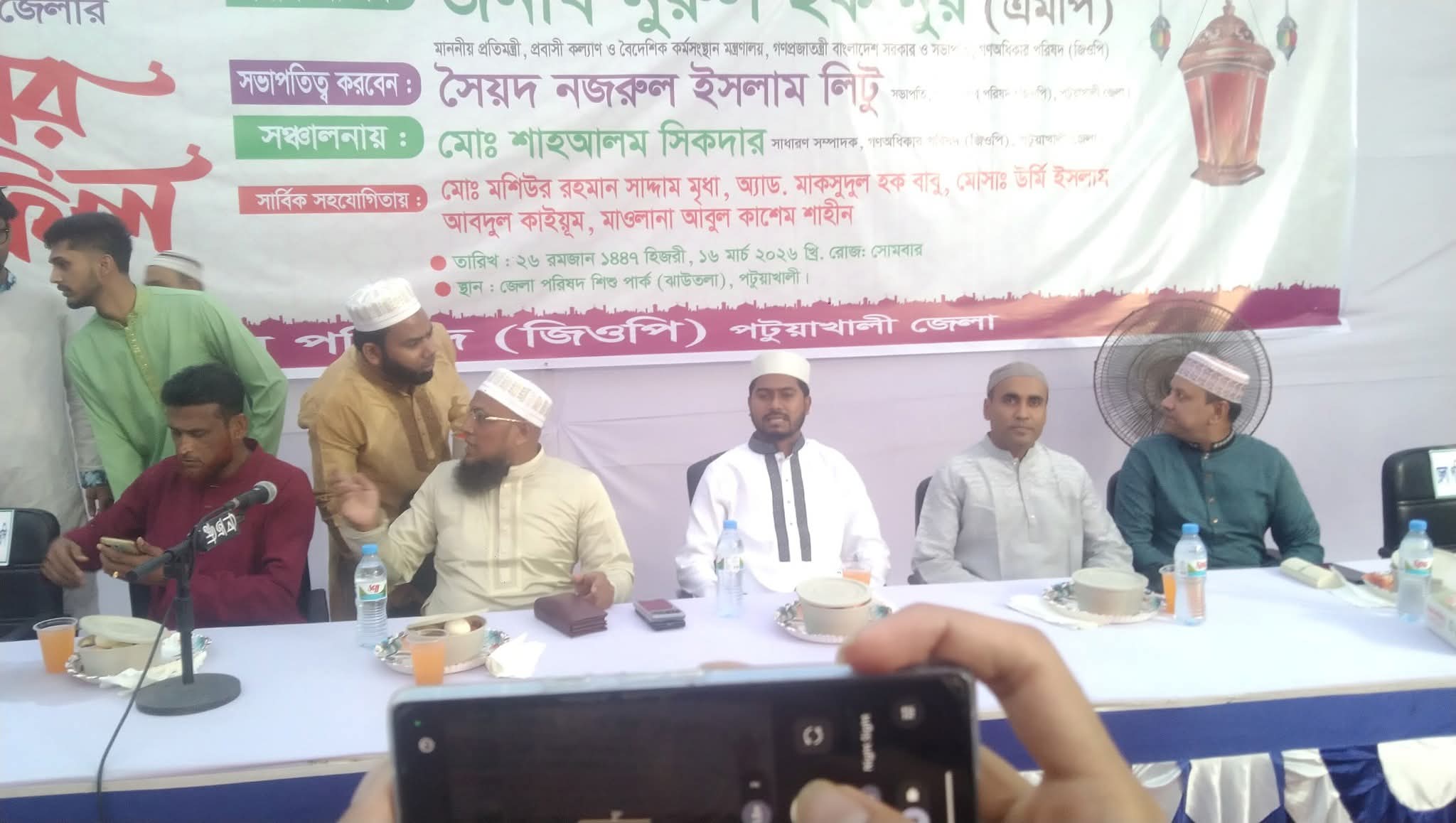 পটুয়াখালী প্রতিনিধি ঃ গণ অধিকার পরিষদ( জিওপি) পটুয়াখালী জেলা শাখার আয়োজনে ইফতার মাহফিল অনুষ্ঠিত। ১৬ মার্চ সোমবার (২০২৬) ২৬ রমজান পটুয়াখালী জেলা পরিষদ শিশু পার্কে এ ইফতার মাহফিল অনুষ্ঠিত হয়। উক্ত ইফতার মাহফিলে প্রধান অতিথির বক্তব্য রাখেন প্রবাসী কল্যাণ ও বৈদেশিক কর্মসংস্থান মন্ত্রণালয়ের প্রতিমন্ত্রী নুরুল হক নুর এমপি। এসময় গন অধিকার পরিষদ (জিওপি) পটুয়াখালী জেলা শাখার সভাপতি সৈয়দ নজরুল ইসলাম লিটু’র সভাপতিত্বে এবং সাধারণ সম্পাদক মোঃ শাহ আলম সিকদার এর সঞ্চালনায় অন্যান্যদের মধ্যে বিশেষ অতিথির বক্তব্য রাখেন পটুয়াখালী জেলা পরিষদের প্রশাসক ও জেলা বিএনপির সভাপতি স্নেহাংশু সরকার কুট্টি প্রমুখ। এ ইফতার মাহফিলে এসময় গণ অধিকার পরিষদ (জিওপি)’র উচ্চতর পরিষদের সদস্য কৃষিবিদ শহিদুল ইসলাম ফাহিম, পটুয়াখালী জেলা প্রশাসক ড. মোহাম্মদ শহীদ হোসেন চৌধুরী, পটুয়াখালী জেলা বিএনপির সাধারণ সম্পাদক এ্যাডভোকেট মোঃ মজিবুর রহমান টোটন, পটুয়াখালী এলজিইডির নির্বাহী প্রকৌশলী মোঃ হোসাইন আলী মীর বাংলাদেশ জামায়াতে ইসলামী’র পটুয়াখালী জেলা শাখার আমীর এ্যাড,নাজমুল আহসান সহ গন অধিকার পরিষদ (জিওপি)’র কেন্দ্রীয় কমিটির বিভিন্ন স্তরের নেতৃবৃন্দ, গণ অধিকার পরিষদ (*জিওপি) পটুয়াখালী জেলা শাখার নানা স্তরের নেতা- কর্মী, স্হানীয় গন্যমান্য ব্যক্তি বর্গ ও সাংবাদিক উপস্থিত ছিলেন। প্রসঙ্গ: এ ইফতার মাহফিলের সার্বিক সহযোগিতায় ছিলেন গন অধিকার পরিষদ (জিওপি) পটুয়াখালী জেলা শাখার নেতা মোঃ মশিউর রহমান সাদ্দাম মৃধা,এ্যাড মাকসুদুল হক বাবু,মোসাঃ উর্মি ইসলাম, আবদুল কাইয়ুম, মাওলানা আবুল কাশেম শাহীন